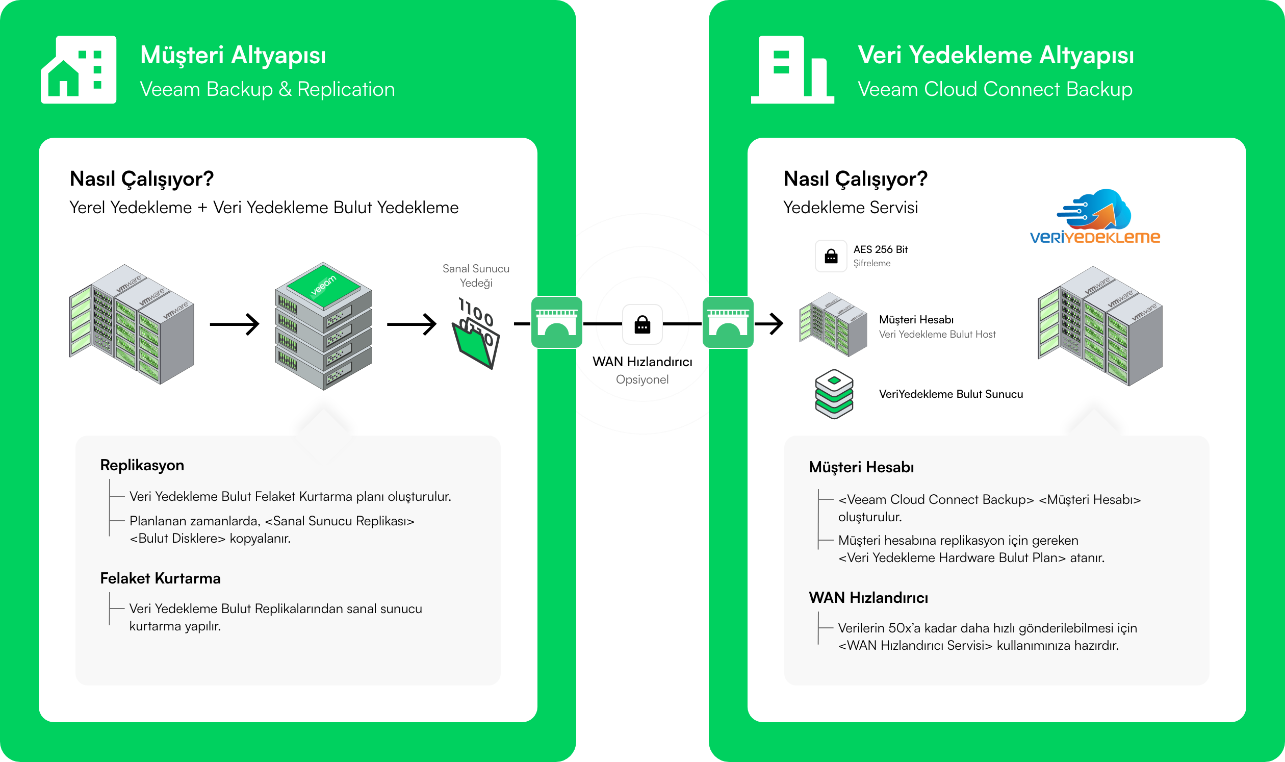 Sanal makine yedekleri, işyeri dışında altyapı kurma ve bu altyapının bakımını yapma maliyeti ve karmaşıklığı olmadan işyeri dışına taşınabilir. Veeam Cloud Connect, buluttan yedekleme ve geri yükleme için tamamen entegre, hızlı ve güvenli bir yol sunar.